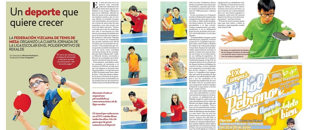 Reportaje en el suplemento Gazteleku del periodico DEIA sobre la Liga Escolar Bizkaina de Tenis de Mesa
